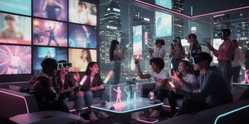Futuristic K-Pop concert stage with neon lights and performing idols, symbolizing anticipated comebacks.